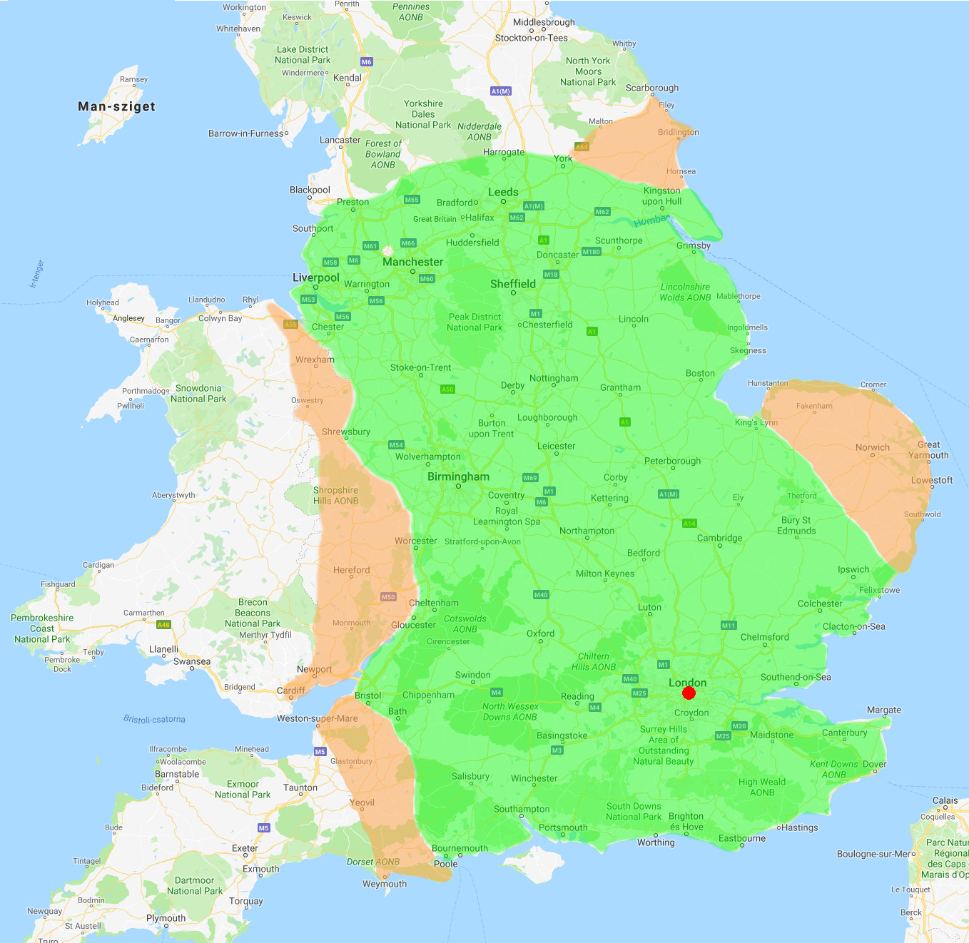 Anglia nagy területére szállítunk, melyet az első képen zöld és sárga színnel jelöltünk.